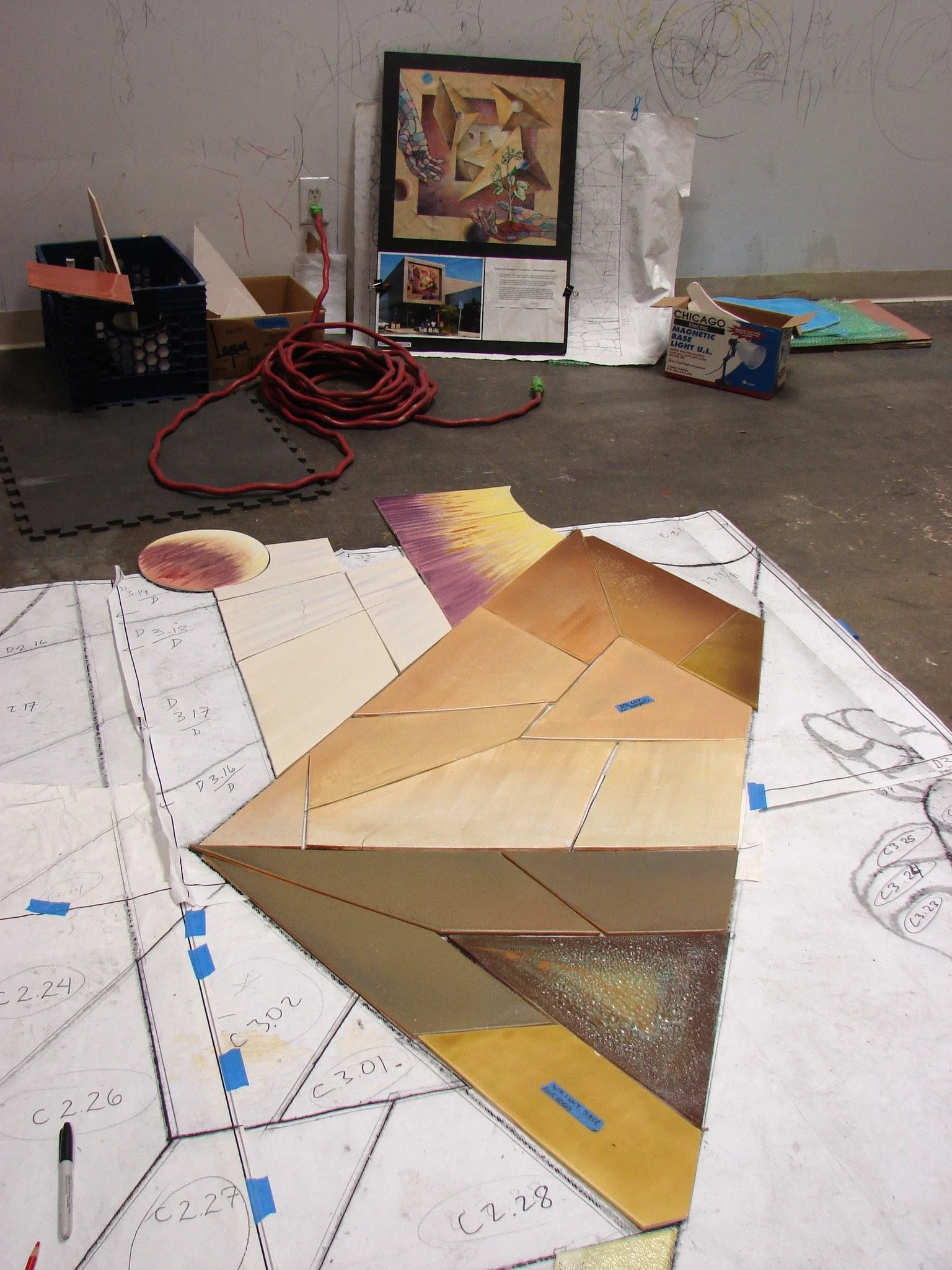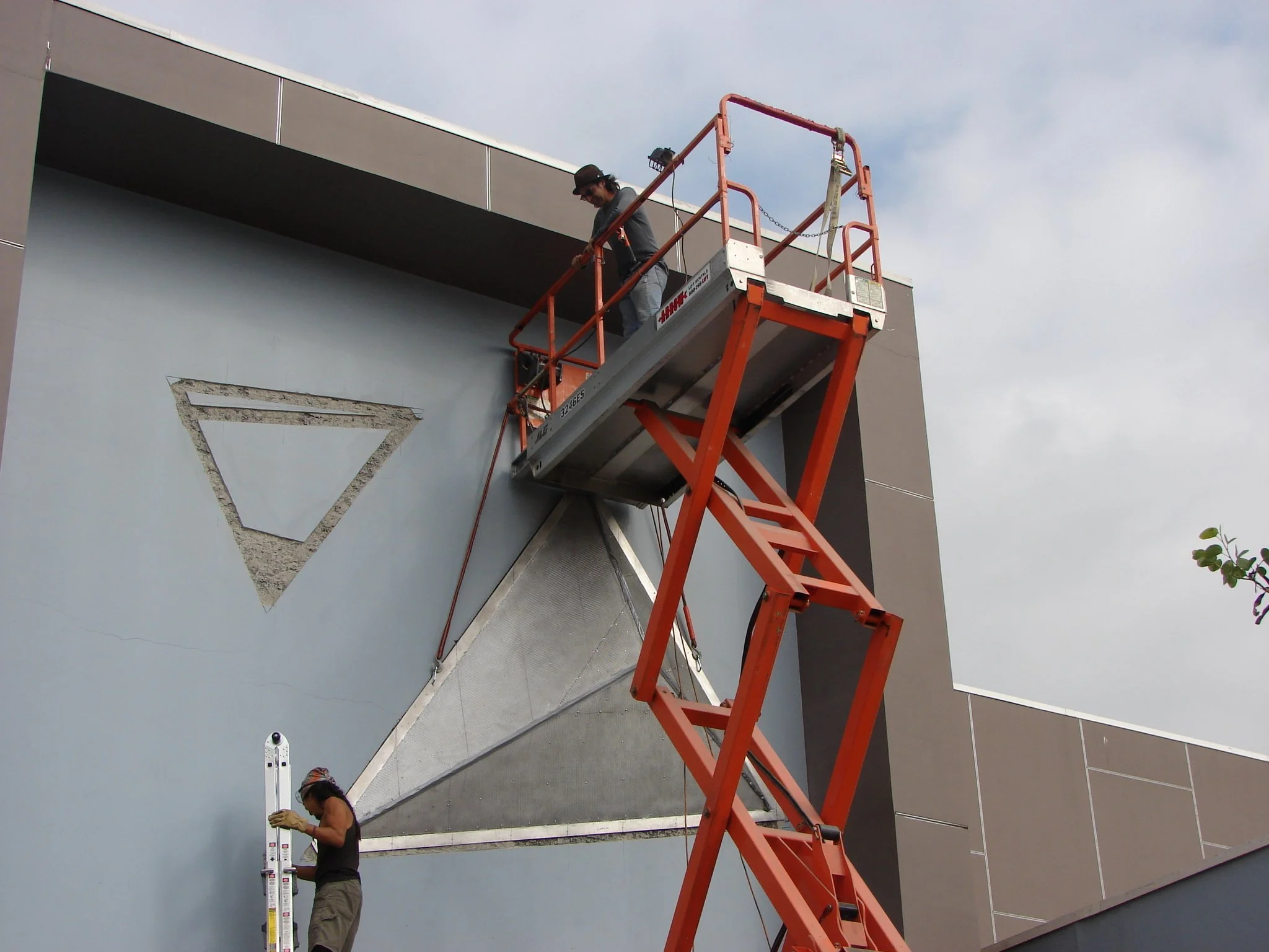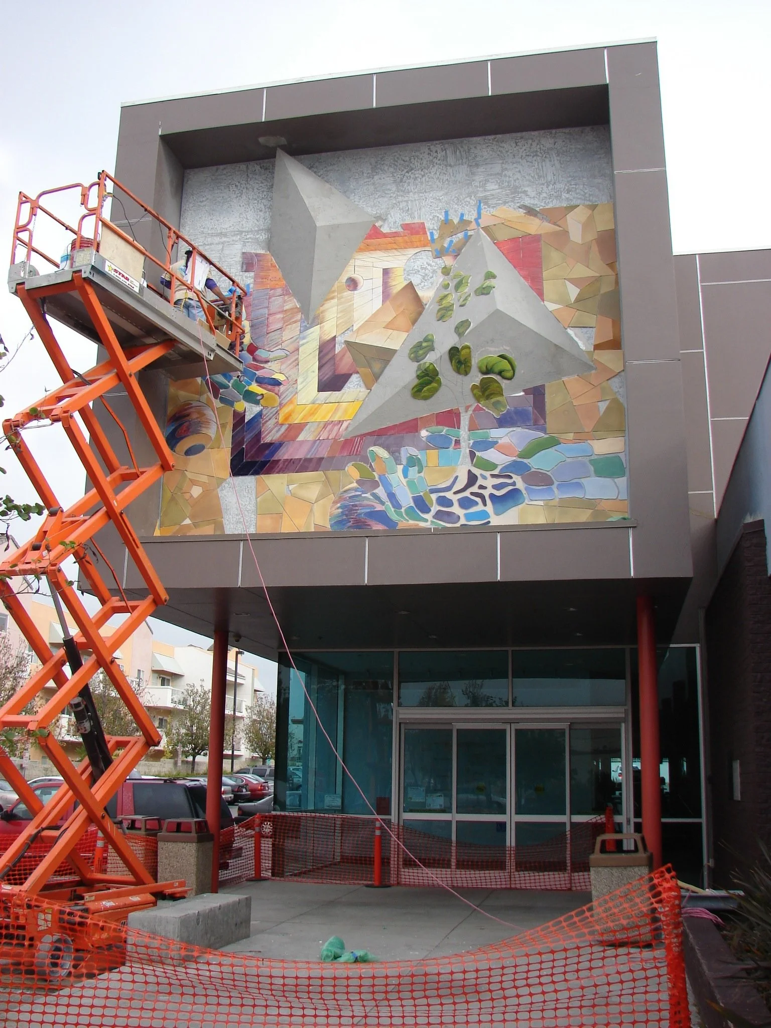 Outpost of Wonder is located at the Monterey Park Public Library. It is a Mixed media, three dimensional mosaic mural sculpture installed on the exterior main entrance. Measuring 17.5' x 19', the artwork consists of inlay ceramic and glass tile, custom cable suspension, aluminum spheres, cast resin large scale welded aluminum geometric forms and stainless aviation cables that results in a work that utilizes three dimensional elements to create a sculptural effect. This concept required a comprehensive approach in design, fabrication, installation and construction administration including schematic drawings, plans and working with city engineering and building departments toward production.